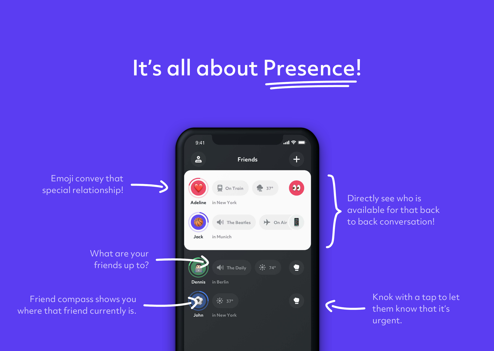 If you’re on your phone, people can text you. If not, they can knock and send you a temporary 10-second notification. A chat is opened if you see and respond to the notification in time. If not, it disappears and doesn’t give you the feeling of missing something important. We completely reversed the role of notifications. We make it harder to reach you and don’t permit anyone to take up your time and brain capacity at any time of their choosing.